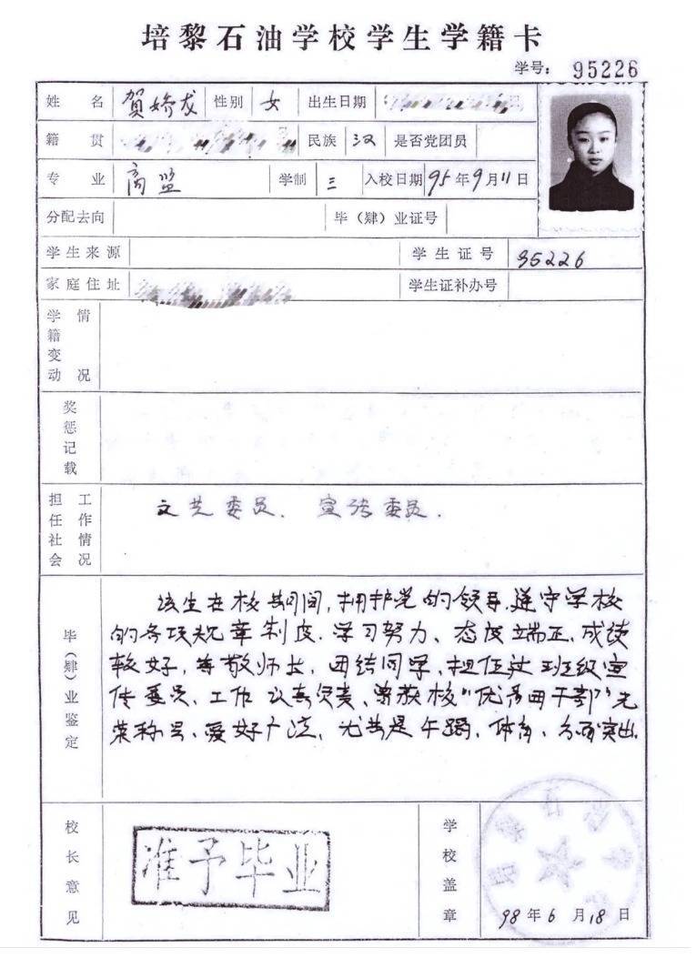 薄薄的纸张上,记录着一个新疆女孩远赴兰州求学的足迹:她曾是班上的文艺委员、宣传委员,爱说爱笑,活泼热情;毕业鉴定里那句“担任班级宣传委员、工作认真负责”,以及“优秀团干部”称号,依然清晰。当年老师写下“学习努力、态度端正、团结同学”时,或许不曾想到,这个女孩将在二十多年后,把母校“手脑并用、创造分析”的精神,带得那么远,践行得那么实。
