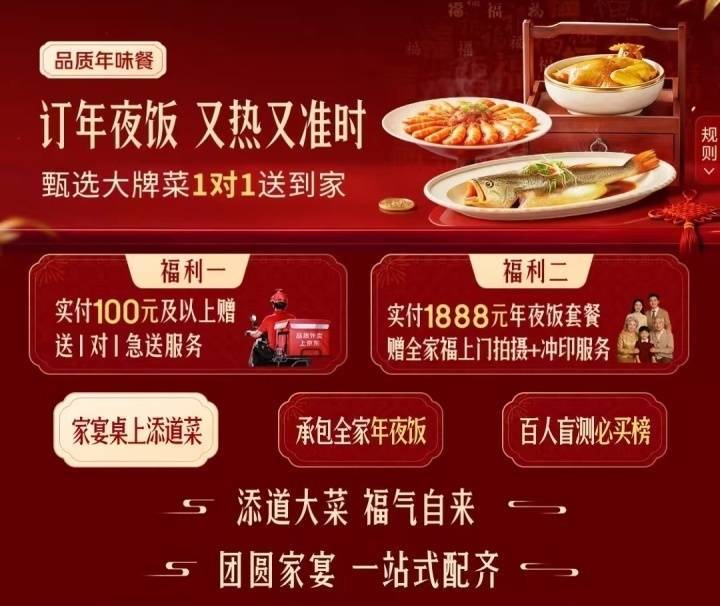 据介绍,即日起至 2 月 16 日,用户打开京东 App,在秒送频道搜索“年夜饭”,即可快速浏览并下单。凡年夜饭套餐实付金额满 100 元,即可享除夕当日一对一急送服务;实付满 1888 元,额外赠送全家福照片冲印服务。