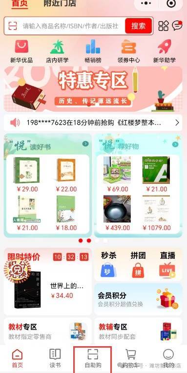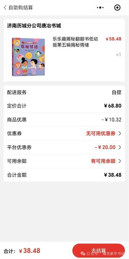 其中线上优惠券为读者在现场自助购书,通过“新华悦购”平台自助购下单使用,订单实交金额大于20元平台自动匹配使用优惠券。