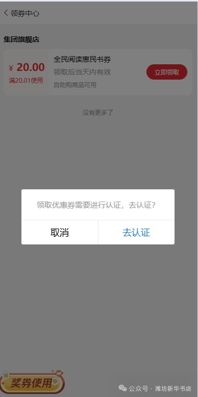 (2)领取书券前需完成身份认证,具体操作如下:点击“立即领取”按钮后,系统将提示需进行身份认证,点击“去认证”(如图1-4,1-5)。