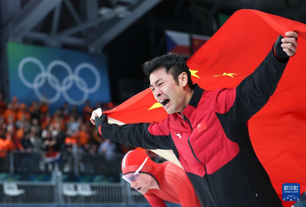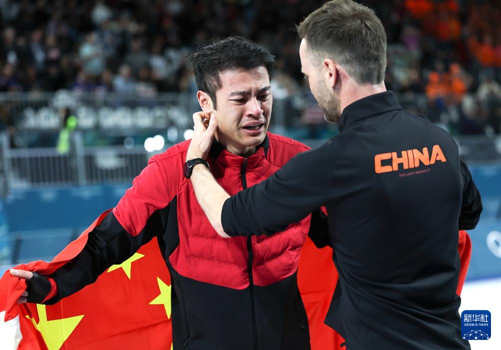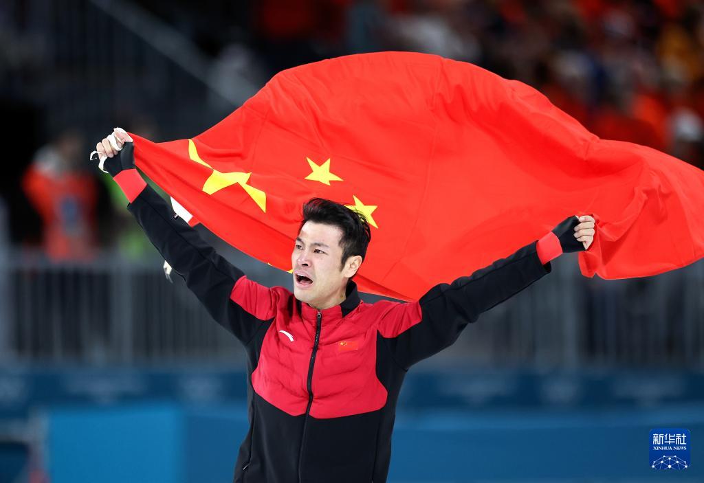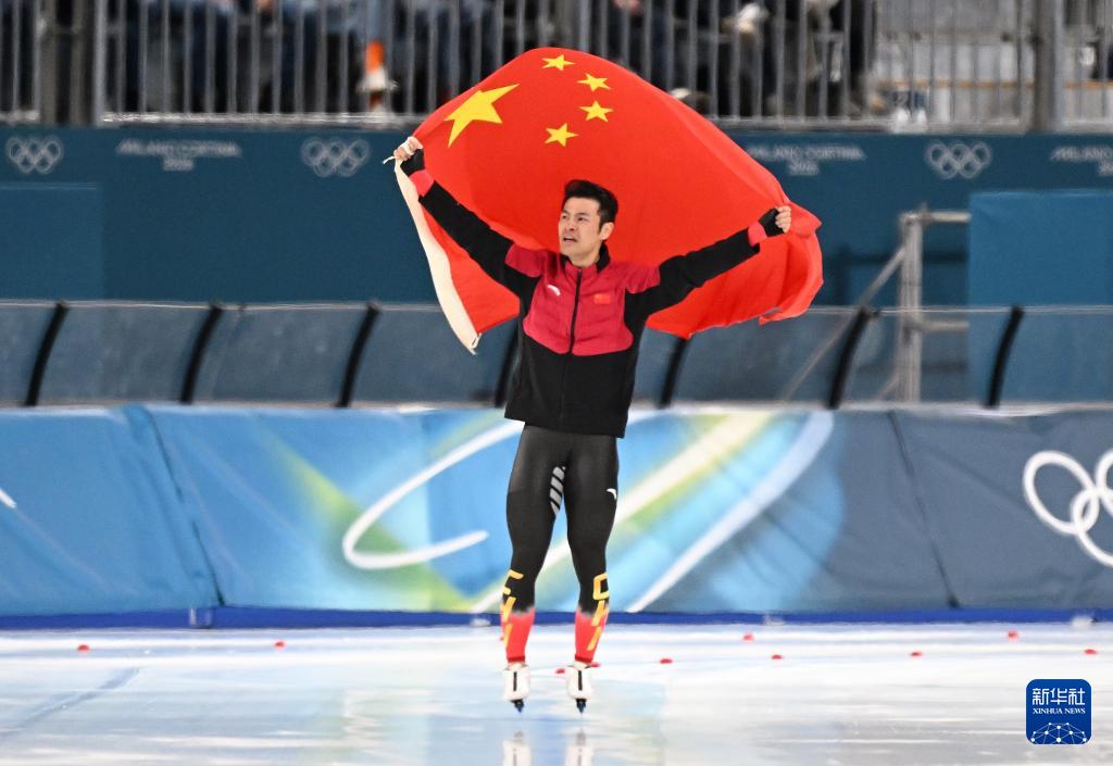 2月19日,宁忠岩在赛后身披国旗庆祝。